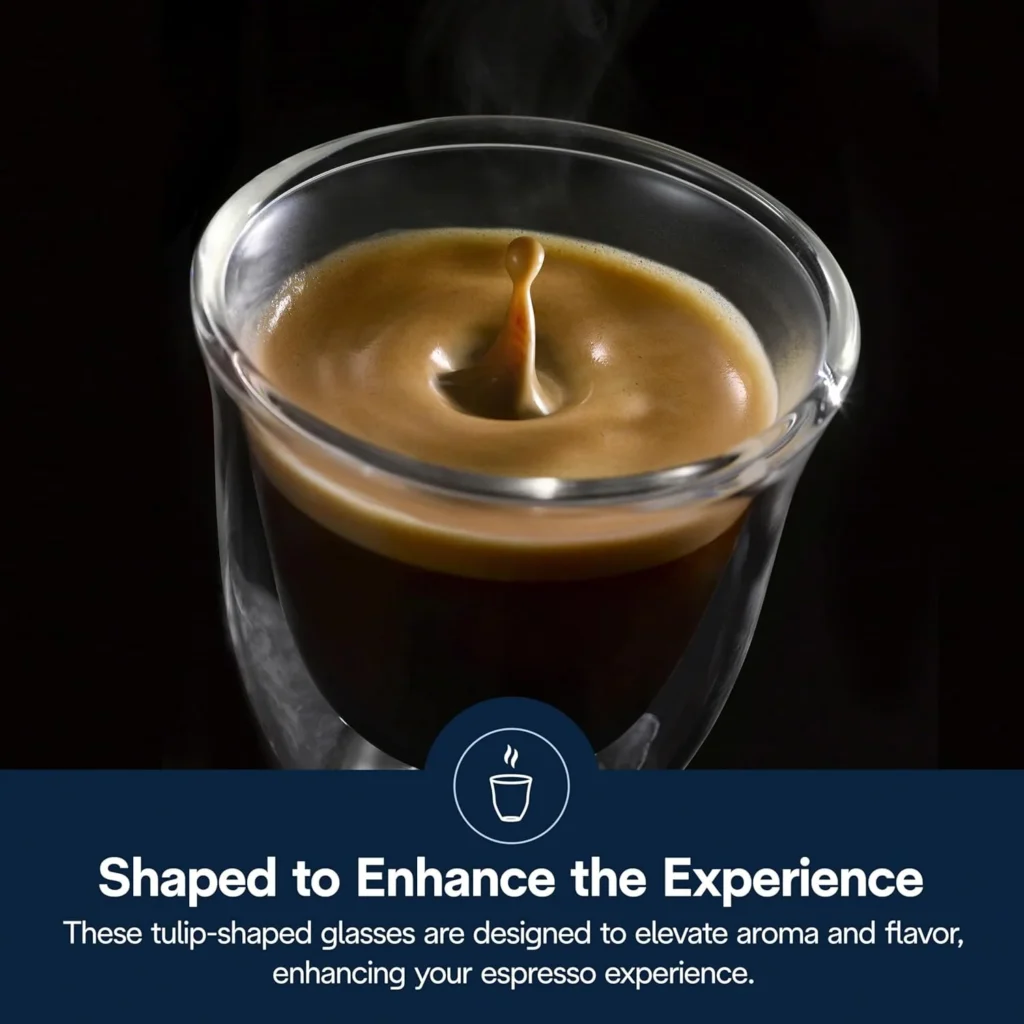 2 attractive double wall espresso glasses• Thermal properties keep your espresso warm for longer• 90 ml glasses provide the perfect serving size and are comfortable to hold• Condensation-free• Easy to clean and dishwasher safe• Made from hand-blown borosilicate glass